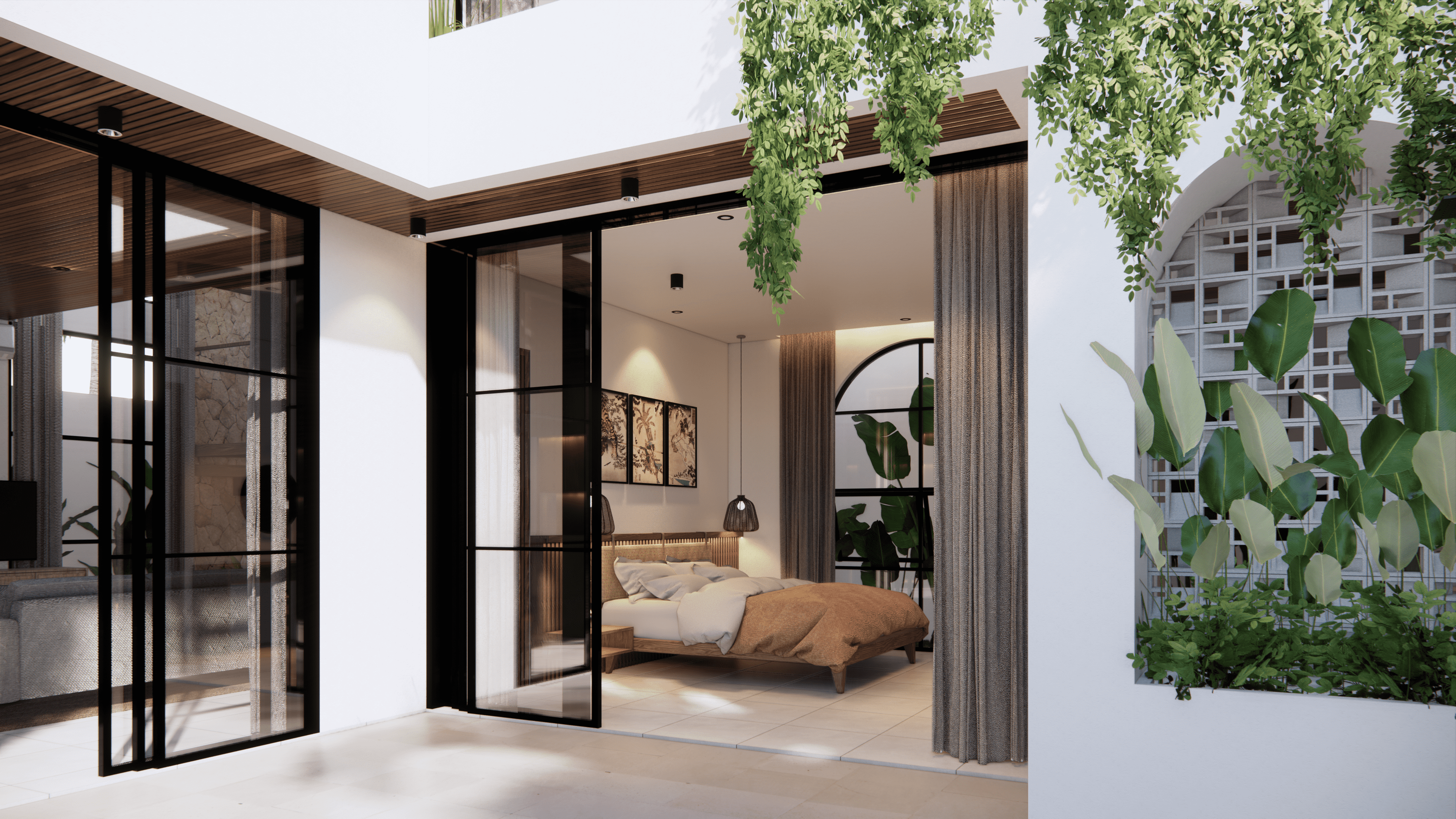 On the ground floor, the spacious living area invites you to unwind, seamlessly connecting to the tropical pool area. Bask in the sunshine, relish moments of pure bliss, and enjoy the open view into the pool area from the master bedroom, bathed in optimal natural light. The integrated kitchen and dining areas create a harmonious and airy space for socialising with friends and family. The guest bedroom on this floor boasts its ensuite bathroom, offering both privacy and convenience.