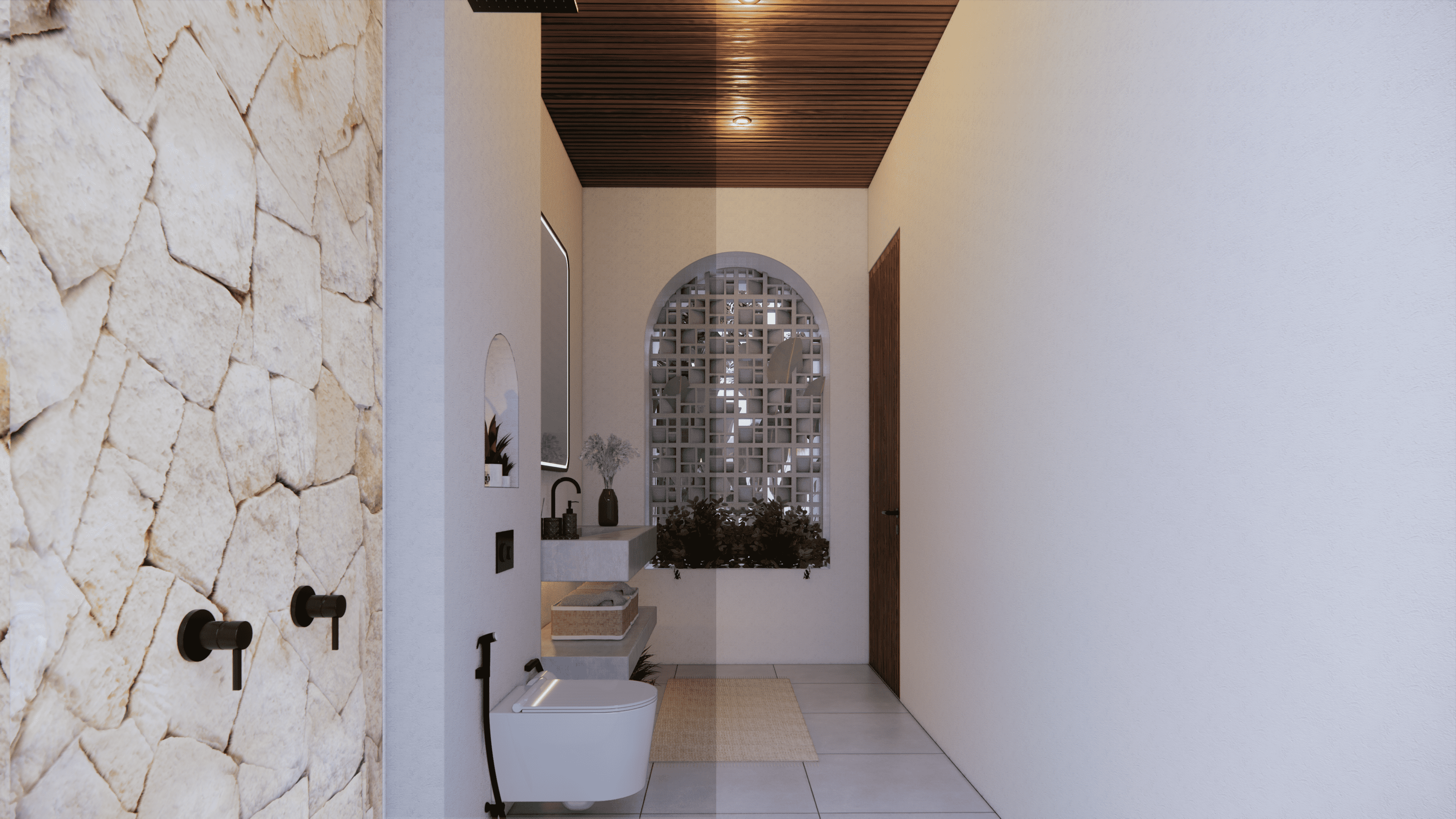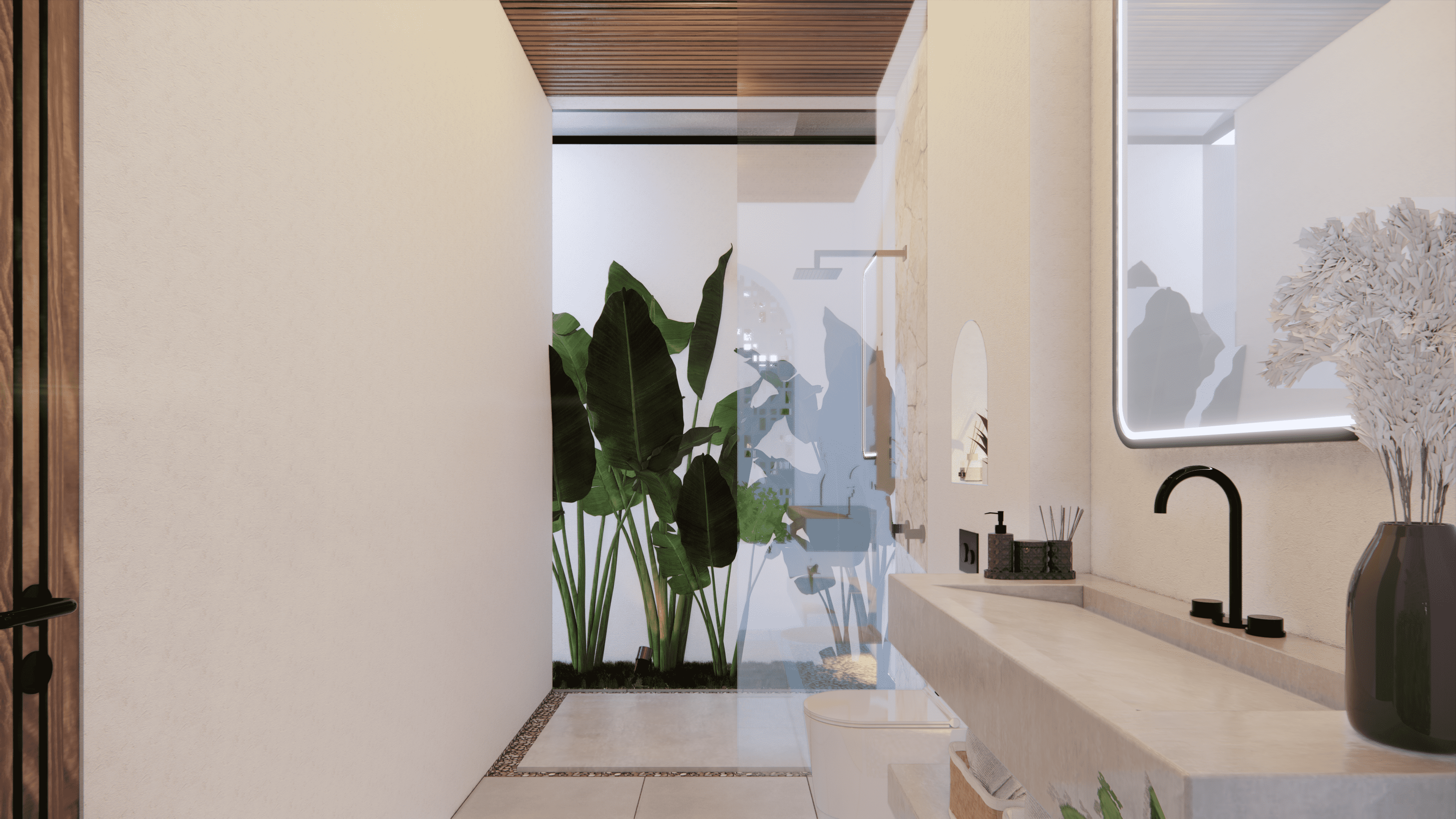 As you ascend the modern staircase to the first floor, discover another luxurious bedroom with its own ensuite bathroom adorned with natural materials. Immerse yourself in comfort and serenity in these beautifully designed spaces, where relaxation and rejuvenation take centre stage.